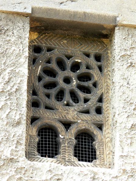 La celosía este es una pieza en caliza blanca en que se calaron dos círculos concéntricos con rosca de doble sogueado; el interior compone una roseta hexapétala y el exterior representa catorce pétalos semicirculares peraltados. Es similar a la celosía oeste de San Miguel de Lillo. Ambas celosías pueden datarse en la segunda mitad del s. IX.