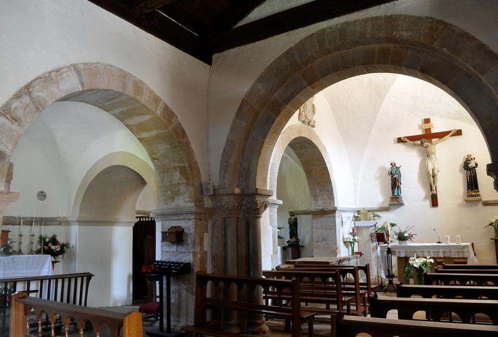 La iglesia está formada por una nave única rectangular, de 13.5 x 5.44 m, rematada por un único ábside de planta cuadrada. Las ventanas, en los muros norte y sur de la iglesia, son bíforas, de caliza blanca, de decoración similar, con una orla perimetral similando un falso alfiz; se han reproducido sus columnillas con capitel troncopiramidal liso. Su talla es similar a las de San Salvador de Valdediós.
