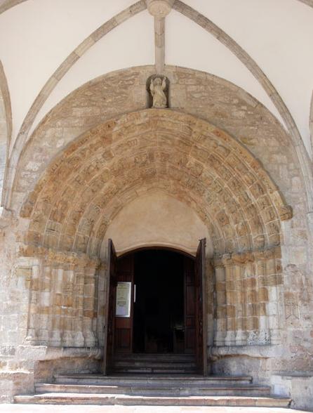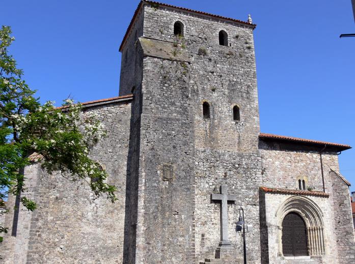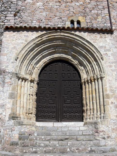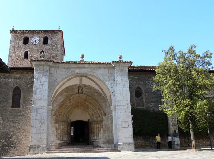 En el exterior tiene dos portadas de ingreso: la del oeste, con una gran torre cuadrada del s. XVII, es la de mayor antigüedad y presenta decoración a base de siete arquivoltas apoyadas en capiteles embellecidos con figuras antropomorfas y zoomorfas bastante deterioradas; a sus pies hay una escalinata. La portada sur, precedida por un pórtico clasicista de 1610, de transición al gótico, presenta cinco arquivoltas decoradas con motivos zoomórficos, antropomórficos y vegetales. A finales del s. XIX se construyó en la cabecera la casa rectoral, de estilo historicista.