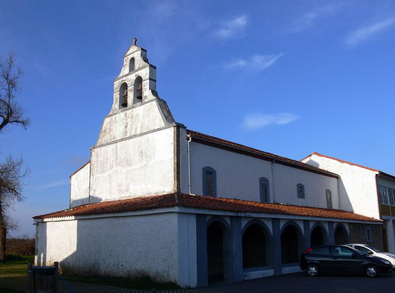 Fue donada en 1130 al Monasterio de San Vicente de Oviedo. Conserva una portada románica fechada en el siglo XII, bajo el pórtico, con dos arquivoltas lisas sobre impostas decoradas con roleos y hojas de vid; los capiteles son troncopiramidales y presentan toscas máscaras humanas entre esquemáticas formas florales. En su interior, recientemente reformado se conserva una pila bautismal de posible filiación románica y en la sacristía una pequeña fuente con una cara humana tallada con la inscripción \"Se hizo el año 1877\".