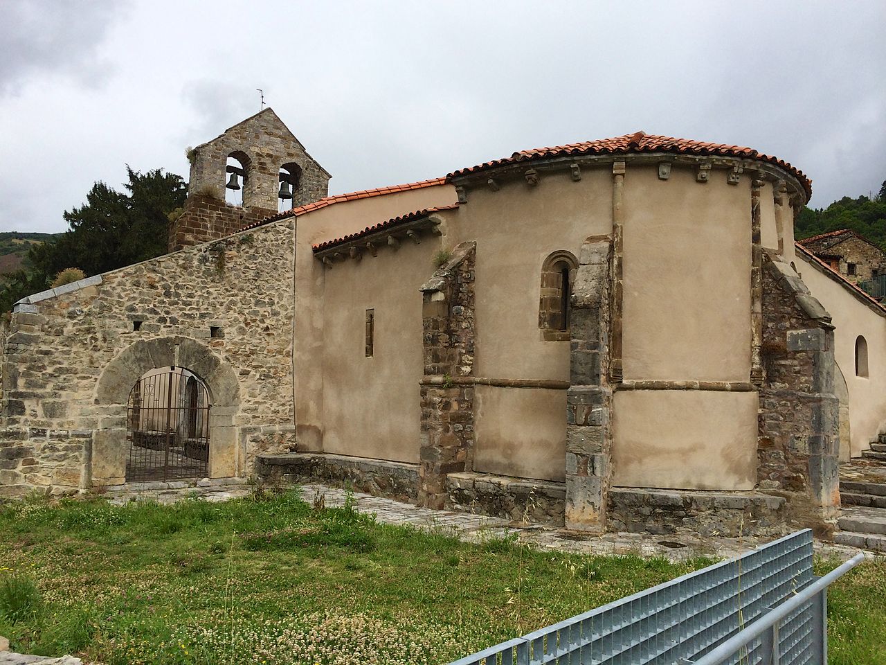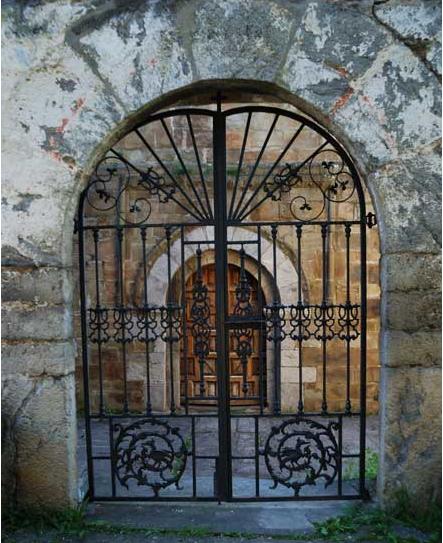 En el muro norte se abre una capilla cuadrada con bóveda de ocho nervios y las fachadas oeste y una parte de la sur están protegidas por un pórtico de sillería.