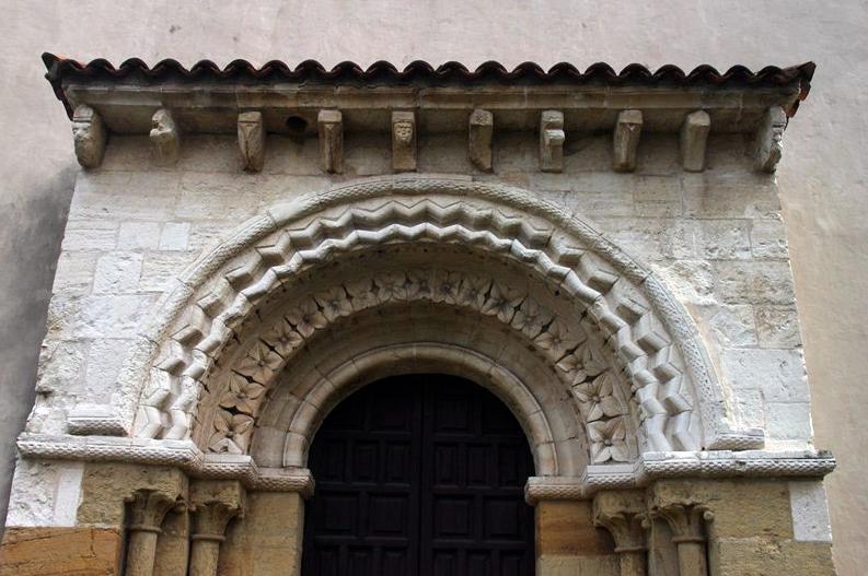 Los principales elementos decorativos son, en el exterior: Ventanita, columnas y zócalo del ábside; canecillos de la cornisa y portada occidental; y en el interior, el arco de triunfo doblado, con columnas.